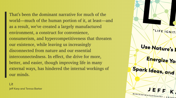 Today's thought comes from "LIT (Life Ignition Tools): Use Nature's Playbook to Energize Your Brain, Spark Ideas, and Ignite Action," by Jeff Karp. Here's a description of the book -- and its author -- from amazon.com: "In an age of convenience and information overload, it’s easy to go through the motions, pressured, distracted, and seeking instant gratification rather than harnessing our potential for meaningful and impactful lives. In LIT, Jeff Karp, Ph.D., professor at Brigham and Women’s Hospital, Harvard Medical School, and biotech innovator, helps us look to nature as a vital source of